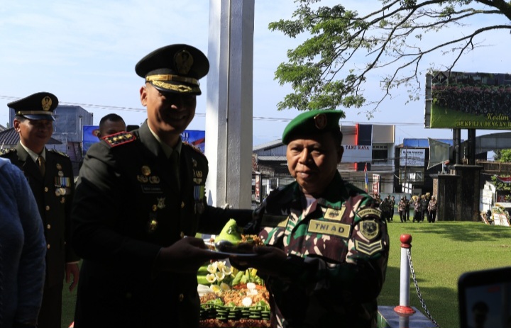 Usai pelaksanaan Upacara, Dandim 0607/Kota Sukabumi melakukan potong tumpeng didampingi Ketua Persit KCK Cab.XVII, Ny. Alia Indra Gunawan. Tumpeng diberikan kepada Anggota yang Purna tugas (pensiun) yaitu Sertu Anwar Basuni yang bertugas sebagai Babinsa Koramil 0607-09/Cisaat.